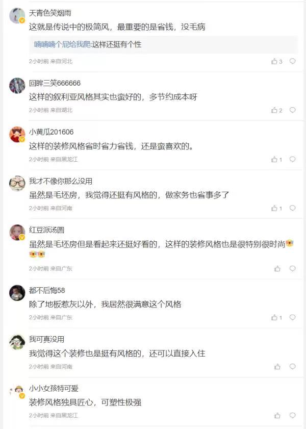 有网友表示,最近,极简装修,逐渐在成为主流。一切从简是大趋势!经常在社交媒体发现,有人因为穷,所以只刮了大白就入住的情况。小于100平米的房子,只有极简主义,才最舒服……逐渐成为了共识!